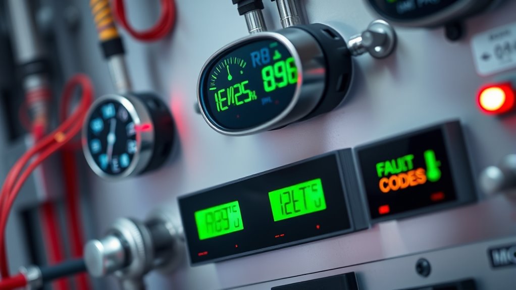 Smart sensors in HVAC systems actively monitor pressures, temperatures, and fault codes to guarantee ideal performance. They provide real-time data that helps you respond quickly to changing conditions, improve energy efficiency, and catch issues early. By continuously calibrating and detecting minor fluctuations, these sensors prevent costly repairs and maintain system reliability. If you want to discover how these advanced sensors can enhance your HVAC efficiency and sustainability, there’s more to learn ahead.