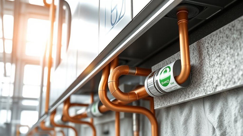 Switching to sustainable materials in HVAC systems allows you to choose recyclable components like eco-friendly insulation and refrigerants with low global warming potential, reducing environmental harm. These options improve energy efficiency, cut down on waste, and support healthier indoor air quality. By adopting eco-conscious materials, you can lower your carbon footprint and enjoy long-term savings. Keep exploring to discover how these sustainable choices can make a real difference in your building’s impact.