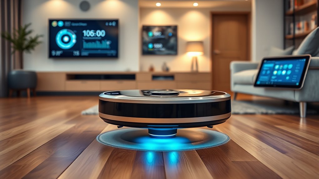 AI and machine learning are transforming how you clean at home by making devices smarter and more adaptive. These technologies enable robots to navigate efficiently, avoid obstacles, and customize cleaning based on your environment. They constantly learn from data, improving routes and performance over time. Regular software updates further refine their capabilities, ensuring ideal cleaning. Stay with us to discover how these innovations can make your cleaning effortless and more effective than ever before.