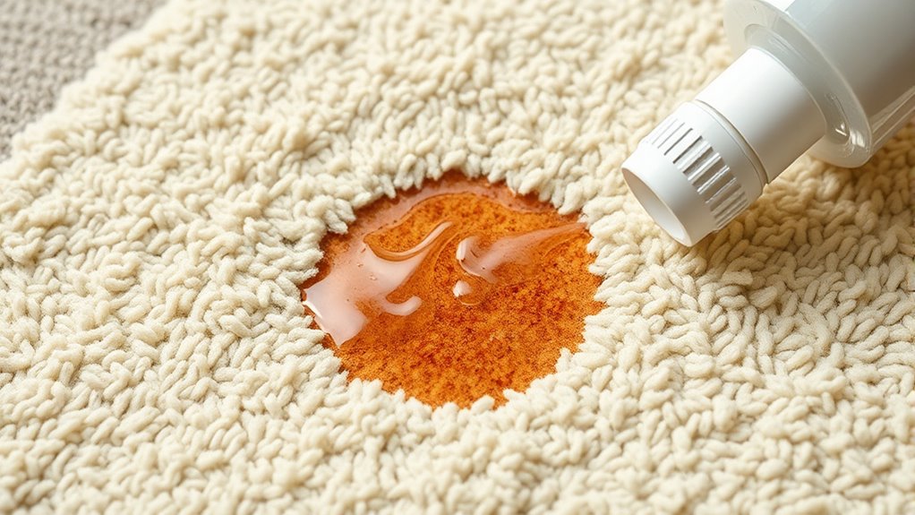 When pet vomit hits your carpet, start by removing solid debris with a paper towel or spoon. Blot the stain gently to soak up moisture, then apply an enzyme cleaner formulated for pet stains. Let it sit for the recommended time so the enzymes can break down organic matter effectively. Afterward, blot again to lift the residue and odors. For thorough cleaning, consider steam or hot water extraction, and make certain the area dries completely. Learning more will help you restore your carpet’s freshness effortlessly.