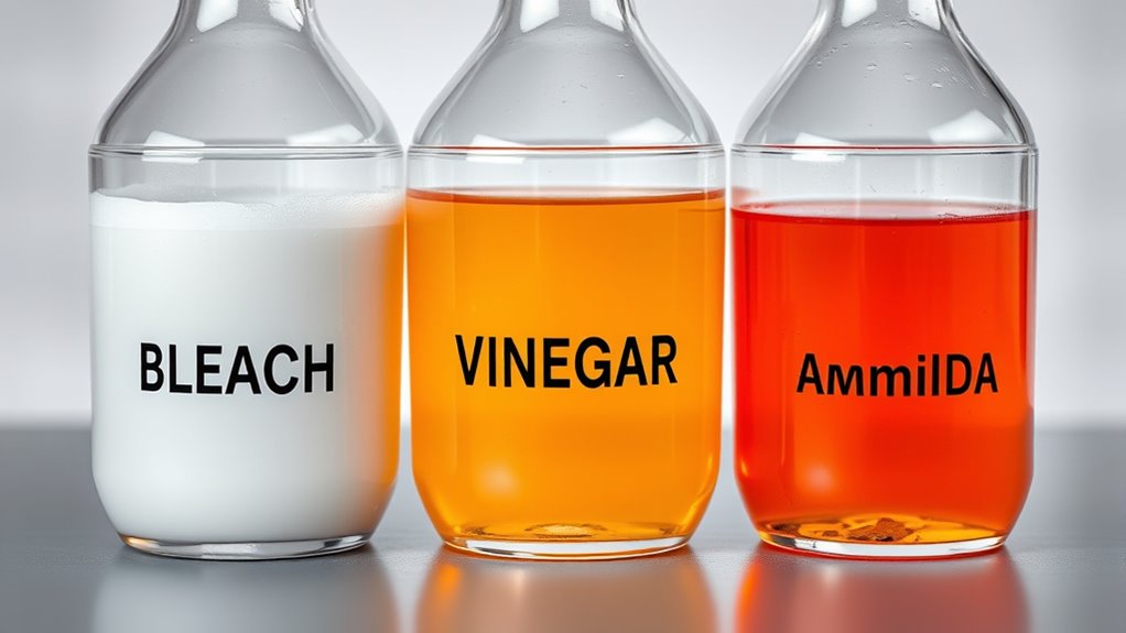 You should never mix bleach with vinegar or ammonia because it causes dangerous chemical reactions. These reactions can release toxic gases that pose serious health risks, including respiratory problems or poisoning. Always follow safety precautions by keeping these substances separate and using them in well-ventilated areas. If you need to combine cleaning agents, consult the product labels or a professional to guarantee safe usage. Never compromise safety for cleaning convenience.