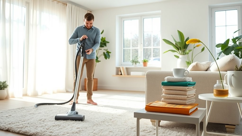 You can maintain cleanliness throughout the year by establishing simple routines and using smart storage solutions. Dedicate 10-15 minutes daily to quick tidying, ensuring clutter stays at bay. Regular routine maintenance, like wiping surfaces and vacuuming, keeps dirt from building up. Invest in organized storage solutions to keep items neatly stored and easily accessible. Consistency is key—making these habits part of your daily life helps keep your home effortlessly clean year-round.