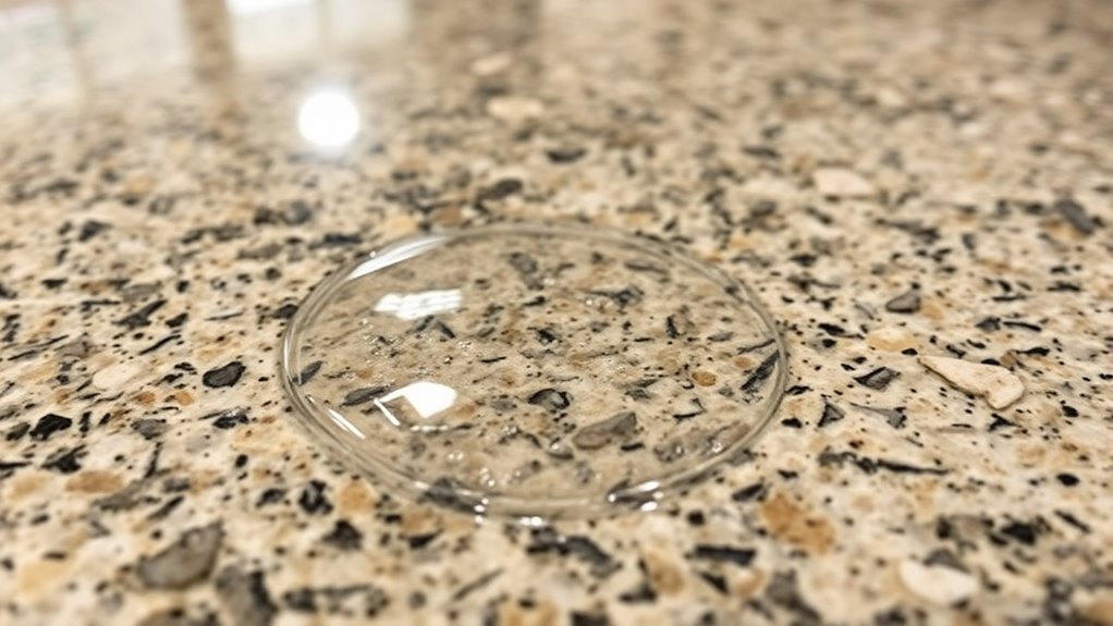 Performing a water test on your granite sealer is an easy way to check if your countertops are properly protected. This simple test can reveal whether your sealer is still effective or if it’s time to reapply. Over time, the sealer’s ability to repel water diminishes, which can lead to increased water absorption and, ultimately, damage to your granite. Monitoring sealer longevity is essential to maintaining the beauty and integrity of your countertops, especially since granite’s porous nature makes it vulnerable to stains and etching without proper sealing. Additionally, advancements in AI in materials analysis are beginning to influence how homeowners can assess and maintain their surfaces more precisely. To perform the test, start by placing a few drops of water in different areas of your countertop. Use a small, clean container or just dispense the water directly from a squeeze bottle. Allow the water to sit for about 10-15 minutes. If your sealer is still doing its job, the water should remain in droplets or beads on the surface, with minimal absorption. If, after this period, the water has soaked into the stone or spread out, it indicates that the sealer has worn down and water absorption is increasing. This absorption can accelerate staining or etching, especially if the water contains minerals or other substances. The key to understanding the results lies in observing how the water behaves. Beads and droplets signify that the sealer is still effective and providing a protective barrier. Conversely, if water begins to darken the granite or seeps into the stone, it’s a clear sign that the sealer’s protective layer has diminished. In that case, a recoat is advisable to restore the countertop’s resistance to water and stains. Regular testing helps you avoid the surprise of staining or damage, especially if you notice that water no longer beads up as it used to.