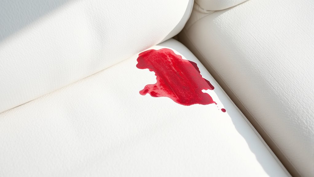 When you spill red wine on your white sofa, acting quickly can make all the difference. The first step is to identify if your fabric is colorfast; if it is, you have a better chance at successful DIY stain removal. Time is critical because the longer the stain sits, the more likely it is to set. Blot the spill immediately with a clean, absorbent cloth to lift as much liquid as possible. Avoid rubbing, which can push the stain deeper. If your fabric is colorfast, you can start applying a homemade cleaning solution right away. Quick action prevents the wine from soaking in further, giving you a better shot at removing the stain before it becomes permanent. Remember, speed is your best ally.