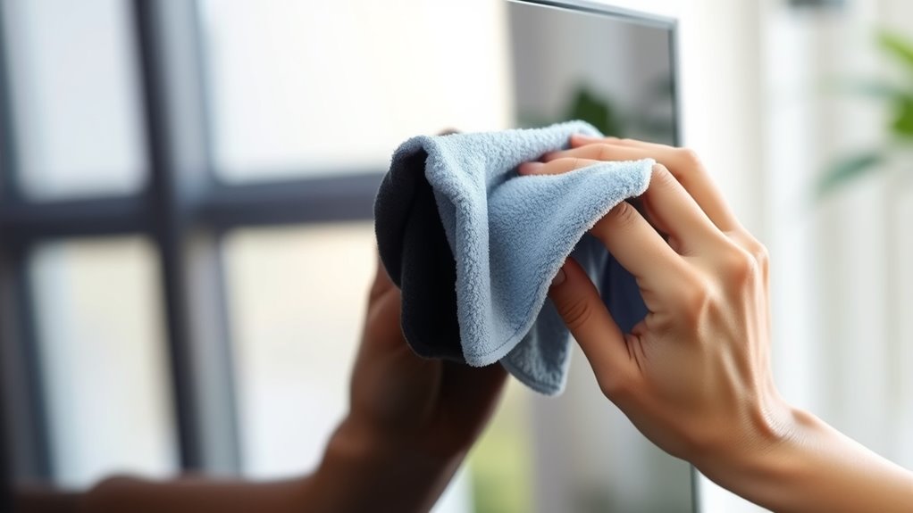 You should avoid using paper towels or rough cloths on your TV screen because they can cause scratches, especially when dust is present. Instead, opt for a soft, lint-free microfiber cloth to gently remove dust and smudges. This careful approach helps prevent screen scratches and makes sure effective dust removal without damaging your TV’s delicate surface. Always use light, circular motions for the best results.