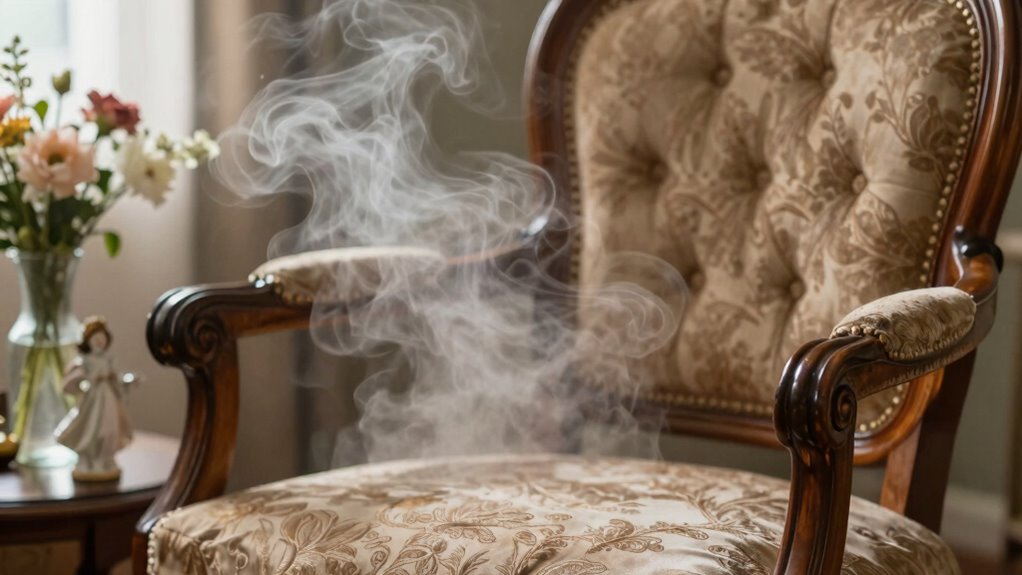Like walking on thin ice, steaming can harm certain furniture finishes if you’re not careful. Steam damage to delicate finishes can occur quickly, causing warping, discoloration, or peeling. You should avoid steaming on unfinished wood, lacquer, or painted surfaces, as the moisture and heat can break down these finishes over time. Always test a small, hidden area first to prevent ruining your furniture’s appearance and longevity.