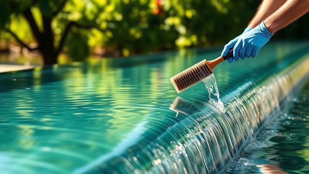 Likewise, the weir needs regular attention. Over time, it can collect debris that might obstruct water flow over the edge, diminishing the infinity effect and impairing circulation. Cleaning the weir involves removing any leaves or dirt and rinsing it thoroughly to guarantee it functions correctly. This simple maintenance task helps keep the water flowing smoothly over the edge, preserving the seamless visual illusion that defines an infinity pool. Proper water circulation, supported by clean weirs and catch basins, not only maintains the aesthetic but also minimizes algae buildup. Algae tend to develop in stagnant, nutrient-rich water, so any interruption in circulation can accelerate its growth. Ensuring proper water chemistry and filtration further supports algae prevention and keeps the water quality high. In addition to cleaning, maintaining appropriate chemical levels and ensuring good filtration are essential for algae prevention. Regularly testing your water and adjusting chlorine or algaecide levels helps keep algae at bay. When your circulation system operates efficiently, and debris is regularly removed from the weir and catch basin, you create an environment less hospitable to algae. This combination of proper water flow, debris management, and chemical balance ensures your infinity edge pool stays strikingly beautiful and inviting for years to come.