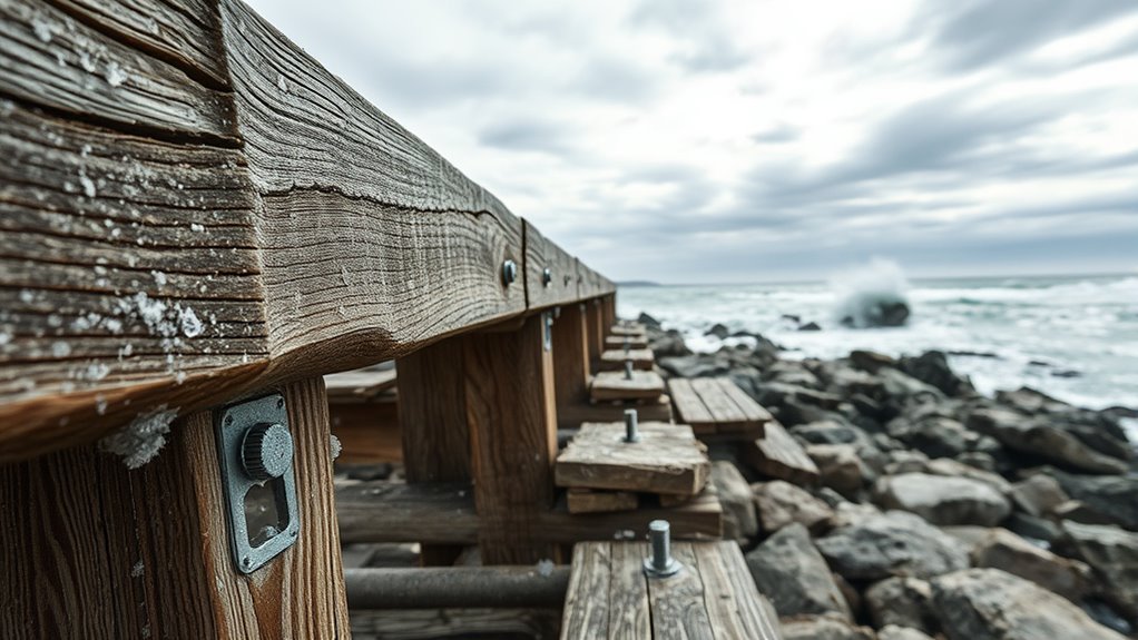 You need to contemplate local climate variations because they directly impact your material choices. For example, higher humidity and salt exposure require corrosion-resistant materials like stainless steel or treated wood. If wind is stronger, opt for durable, wind-resistant options. You should also account for temperature fluctuations, which can cause expansion or contraction, affecting material longevity. Understanding these variations helps you select materials that withstand your specific coastal environment effectively.