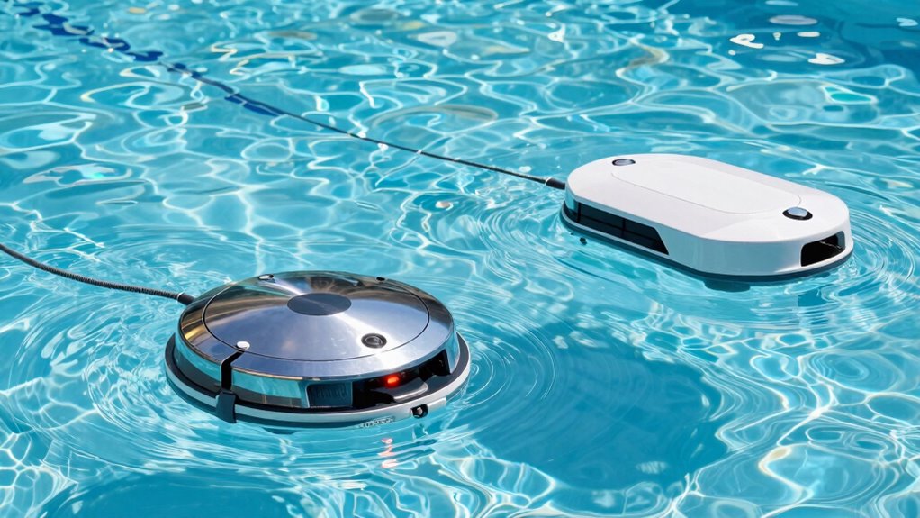 Choosing between corded and cordless robotic pool cleaners depends on your pool size and cleaning needs. For instance, if you have a large pool, a corded model might be more reliable, while a cordless cleaner offers greater flexibility for smaller pools. Imagine saving time and effort with a cordless model that easily maneuvers around obstacles—making maintenance simpler. Ultimately, pick the one that fits your pool, budget, and lifestyle for effortless, sparkling results.