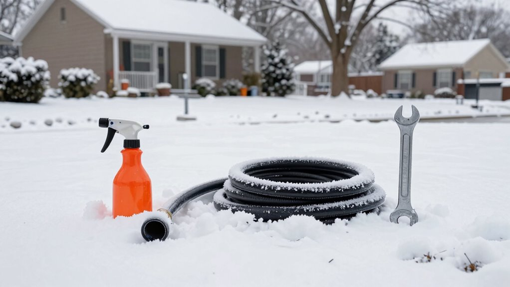 As winter approaches, it’s essential to drain and winterize your outdoor irrigation and sprinkler systems to prevent damage from freezing water. Proper drainage guarantees your system’s outdoor fixtures won’t crack or burst in cold weather. To do this effectively, you should: