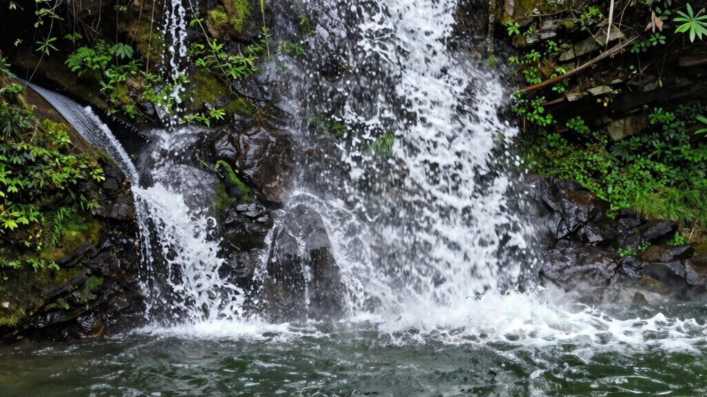 Splash-out from waterfalls can harm the environment by disturbing wildlife and degrading water quality. You might notice animals abandoning their habitats or becoming stressed due to increased noise and vibrations. Additionally, excess splashed water can carry pollutants, leading to water contamination that affects aquatic life. To minimize these impacts, you should implement splash control measures, ensuring the ecosystem remains balanced and healthy.
