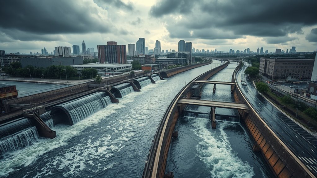 Traditional approaches to managing storm overflow and bypass issues have long relied on infrastructure solutions designed to temporarily redirect excess water. You might use oversized storm sewers, retention basins, or detainment ponds to hold or channel stormwater during heavy rainfalls. These systems aim to prevent flooding by expanding capacity or creating bypass routes that divert water away from urban areas. You may also see the use of outfalls and overflow pipes to discharge excess water safely into nearby water bodies. Maintenance of these systems is crucial to ensure they function properly when storms hit. While effective in reducing immediate flooding, these methods often address symptoms rather than underlying causes, and they can lead to environmental concerns if not properly managed. Incorporating total‑cost clarity into infrastructure planning can help optimize long-term performance and environmental impact.