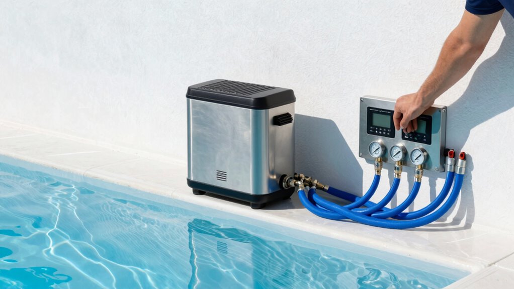 To guarantee your saltwater generator operates efficiently and produces the right amount of chlorine, it’s crucial to regularly adjust its settings based on your pool’s conditions. Monitoring your chlorine levels is key to maintaining proper pool maintenance and avoiding issues like algae or dull water. Start by testing chlorine levels weekly, then tweak the generator’s output accordingly. Increase the setting if chlorine levels are low or decrease if they’re too high. Keep an eye on the weather and usage, as these affect chlorine demand. Consistent adjustments ensure balanced water chemistry and efficient generator performance.