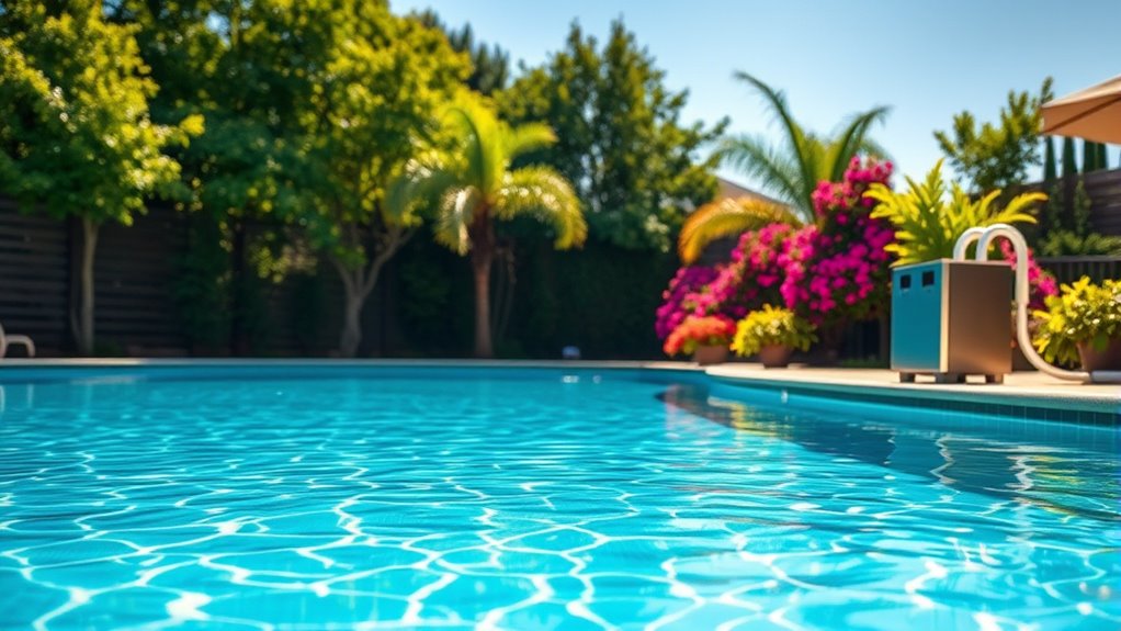 Switching to sustainable chemical alternatives like saltwater systems or natural sanitizers helps you keep your pool clean while reducing environmental impact. Saltwater pools produce gentle chlorine through electrolysis, cutting down on harsh chemicals, while natural options use mineral, biological, or plant-based methods to inhibit bacteria and algae. UV and ozone sterilization further improve sanitation without chemicals. By choosing these eco-friendly solutions, you protect your health and the planet—explore more ways to create a safer, greener pool environment.