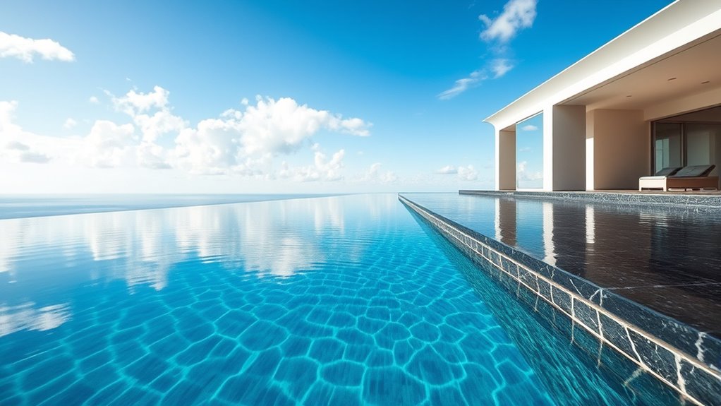 Seamless edge finishing plays a vital role in creating a mirror-like appearance on your vanishing-edge pool. Achieving this flawless look requires careful attention to materials and construction techniques. First, use high-quality, precision-cut materials like polished stainless steel or custom-cast concrete edges that fit tightly without gaps. Second, guarantee proper bonding methods—such as waterproof sealants or epoxy—that prevent leaks and smooth out any imperfections. Third, pay close attention to the finishing process, sanding and polishing edges meticulously to eliminate ridges or irregularities. These steps help create a clean, continuous visual line. Additionally, understanding the importance of emotional support during construction can help address potential stress or concerns related to project timelines and outcomes. With careful material selection and precise craftsmanship, your pool will boast a sleek, mirror-like edge that enhances its aesthetic and functional appeal.