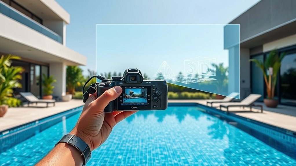 Using 3D and VR design previews lets you visualize your pool project in detail before construction begins. These tools allow you to explore models from multiple angles, test different materials and lighting, and see how your yard will look in real time. You can collaborate easily with contractors and make adjustments on the spot. This immersive technology guarantees your final design matches your vision, and if you keep exploring, you’ll discover how it can save time and money.