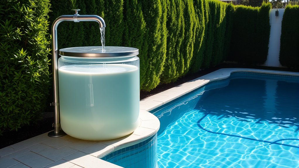 By adopting rainwater collection for pool refills, you’re embracing a smart, eco-friendly solution that saves water and reduces costs. Imagine telling your friends you’re saving the planet with a device that would make even Leonardo da Vinci jealous—an ancient inventor ahead of his time! Every drop counts, so start today and turn your backyard into a modern oasis, proving that innovation and sustainability can go hand in hand, even in this age of smartphones and hoverboards.