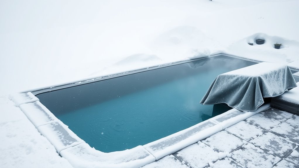 Wondering how to keep your infinity pool’s trough area warm during winter? Covering it with a tarp or blanket is an effective way to insulate and protect it from the cold. Choose a heavy-duty tarp or a dedicated pool blanket to create a barrier against wind and snow. This layer helps retain heat and prevents debris from settling into the trough, making spring cleanup easier. Make sure the cover fits snugly over the entire area, secured with weights or clips to prevent it from shifting. Visualize the tarp stretched tight over the trough, shielding it from icy gusts. Imagine snowflakes landing softly on the cover, melting slowly, and keeping the water beneath warmer and cleaner throughout the cold months. Using the right coverage ensures better insulation and prolongs the pool’s lifespan during harsh weather.