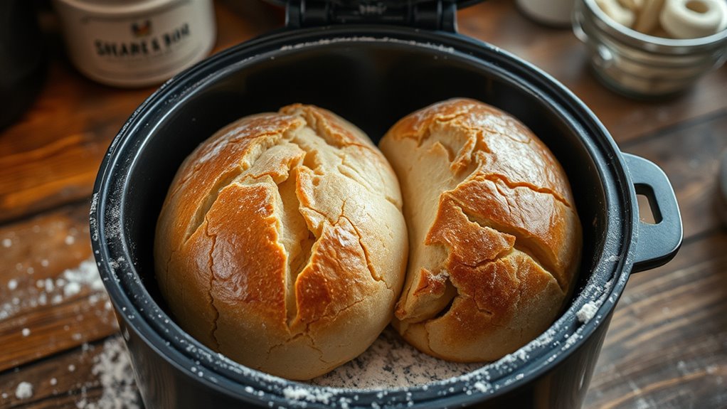 Imagine your loaf collapsing just as it’s about to finish baking—that’s over-proofing. To prevent this, monitor proofing times closely using the bread machine’s settings or proofing techniques. Keep an eye on dough consistency—if it’s overly airy or sticky, it’s a sign to stop proofing sooner. Adjust time accordingly, and your bread will rise perfectly without over-proofing, giving you a fluffy, well-shaped loaf every time.