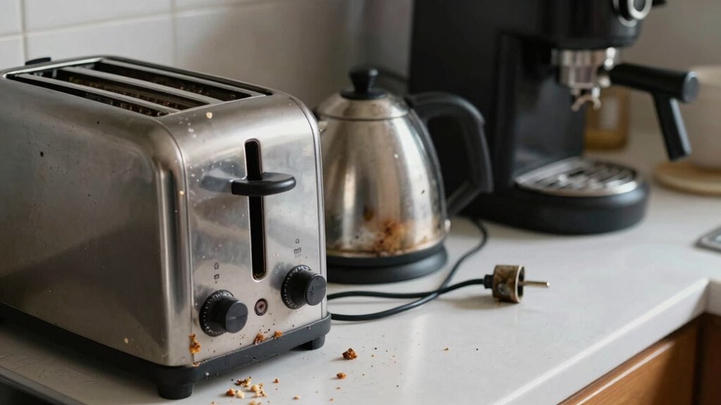 Countertop appliances can cause fires even when unused if you neglect proper maintenance. Dust, debris, or electrical faults can create fire hazards over time. To prevent this, always unplug appliances when not in use, clean them regularly, and check for frayed cords or damage. Following fire prevention tips and routine countertop appliance maintenance guarantees safety, reducing the risk of accidental fires caused by dormant appliances.