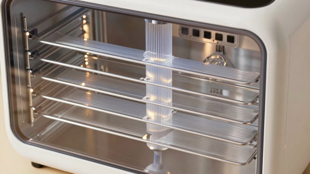 Horizontal and vertical airflow systems in dehydrators operate differently to circulate air and remove moisture. In horizontal airflow models, fans are positioned on the side, creating a flow across the trays. This airflow pattern guarantees even drying but can sometimes cause uneven results if airflow isn’t well-distributed. Proper airflow ensures consistent dehydration, which is crucial for achieving optimal results. Proper airflow also minimizes the risk of infection, which can occur if moisture remains trapped in the material being dried. Additionally, airflow design influences how well moisture is expelled from the material being dried, impacting overall efficiency. The air circulation pattern in vertical airflow dehydrators promotes uniform drying because air moves uniformly through all trays, regardless of position. The dehydrator design influences how effectively air circulates, impacting drying times and consistency. Understanding these airflow mechanisms helps you choose the right dehydrator for your needs, ensuring you get even, efficient results every time.