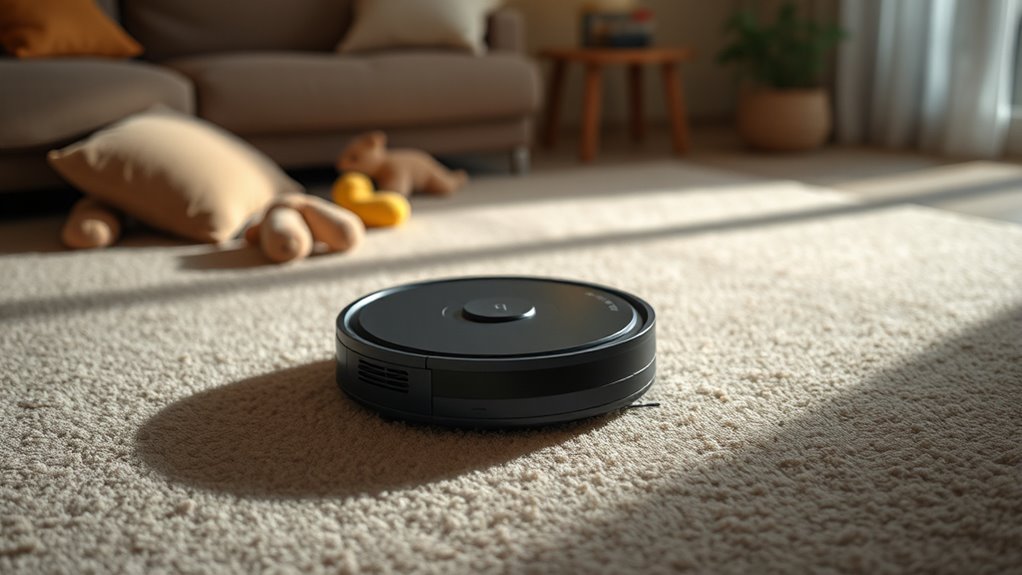 To keep your household peaceful while cleaning at night, choose a robot vacuum with night mode. These devices operate quietly by using special noise reduction features, such as mufflers and slower motor speeds, and are equipped with sensors that detect obstacles, stairs, and drop-offs. Their safety features guarantee they work safely in low light without waking your kids. If you want to know how to maximize your vacuum’s night mode, keep exploring these helpful tips.