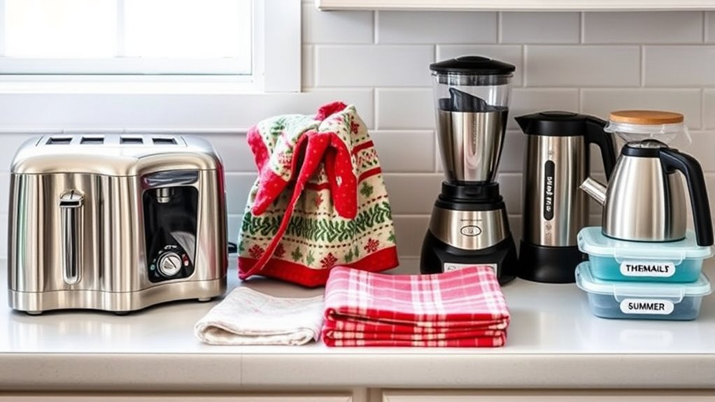 To prepare your small appliances for winter and summer, start by cleaning dust, debris, and filters to improve efficiency. Check cords, plugs, and switches for damage, unplug unused devices, and store them in cool, dry spots away from moisture and extreme temperatures. Use covers or airtight containers for long-term storage, and wrap cords neatly. Keep your appliances safe and ready year-round—keep going for detailed tips on seasonal prep.