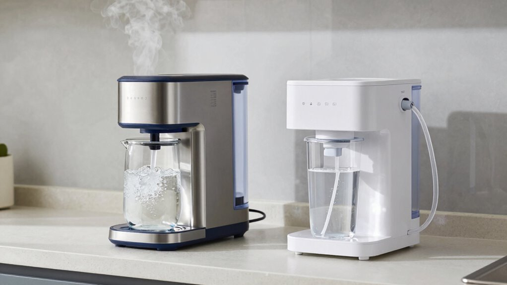 Choosing between a water distiller and a reverse osmosis system is like selecting the perfect brush for your canvas—each offers unique strokes. Think of your water needs as the guiding palette, shaping your choice. Whether you seek pure, mineral-free clarity or a balanced taste with some minerals, the right system will transform your tap into a crystal-clear stream. Trust your instincts, and let your home’s water be a invigorating masterpiece.