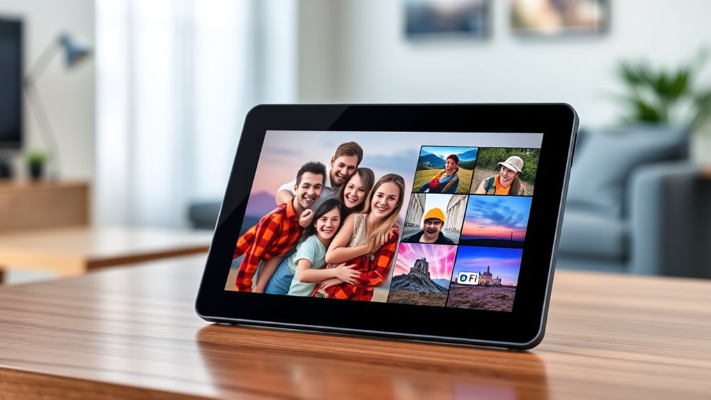Choosing a digital photo frame with email compatibility is vital for effortless sharing. You want a frame that supports email functionality so you can send photos and videos directly to it without hassle. Check if the device provides a dedicated email address or code to guarantee uploads are secure and straightforward. Compatibility with popular email services like Gmail, Yahoo, or Outlook is important to avoid delivery issues. Additionally, see if the frame accepts batch email uploads, allowing you to send multiple photos or videos at once—saving time. Finally, look for features that notify you when new emails arrive or uploads are received, so you can promptly view your shared content. These options make sharing seamless and keep your digital photo experience enjoyable.