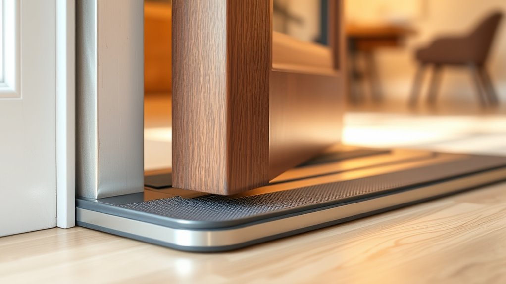 I recommend replacing your door sweep at least once a year for maximum efficiency. Over time, they wear out, crack, or become less effective at blocking drafts. If you notice drafts sneaking through or the sweep looks damaged, it’s time for a change sooner. Regular inspections help guarantee your home stays cozy and energy-efficient. Don’t wait too long—prompt replacements keep drafts out and comfort levels high.