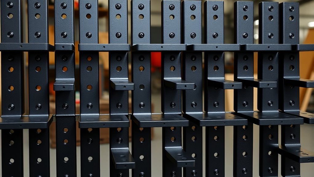 When evaluating heavy duty L brackets, paying attention to their finish coating is essential because it determines how well they resist corrosion and rust, especially in outdoor or humid settings. A durable finish, like powder coating or galvanization, greatly enhances the bracket’s resistance to moisture and surface wear. Thicker, high-quality coatings provide better protection against scratches, chipping, and deterioration over time. Epoxy or polyurethane coatings are particularly effective, offering superior corrosion resistance compared to basic paint or primer finishes. Keep in mind, harsh conditions may require regular maintenance or re-coating to maintain their protective qualities. Choosing brackets with the right finish coating ensures they’ll stand up to environmental challenges, maximizing longevity and supporting your project’s durability.