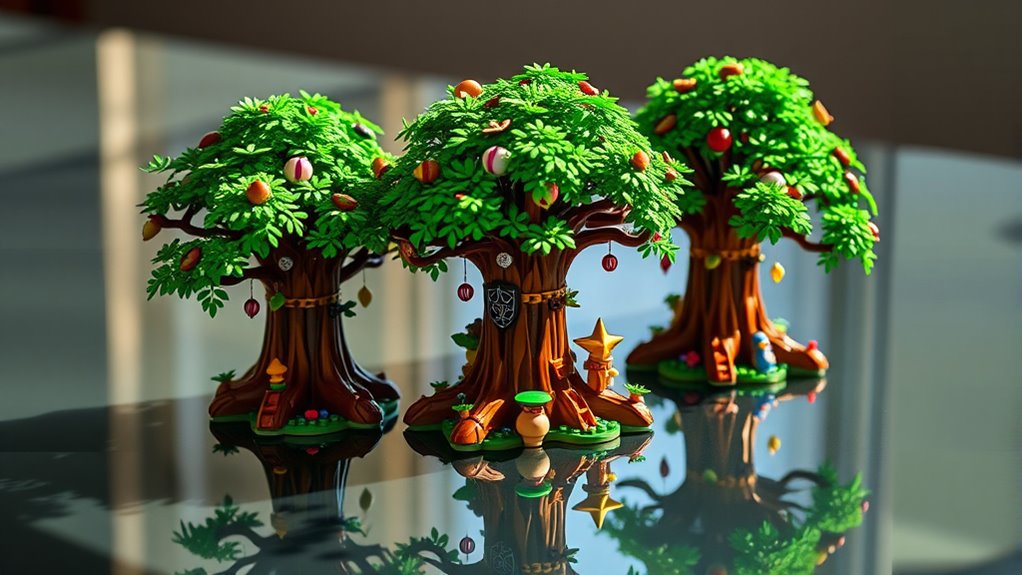 Lighting features can truly elevate the visual impact of your Lego Zelda Great Deku Tree set by highlighting its intricate details and creating a mesmerizing display. LED light kits often include multiple sources, allowing you to illuminate different parts of the model for dramatic effect. They can be powered via USB, power banks, or sockets, offering flexible placement options. Some kits come with QR codes or step-by-step instructions, making installation straightforward even for beginners. The quality of lighting varies, with high-end kits providing anti-heat and anti-burning features, ensuring safety and durability. Additionally, adjustable brightness or color options allow you to customize the mood and emphasize specific sections of the set, making your display truly unique and enchanting.