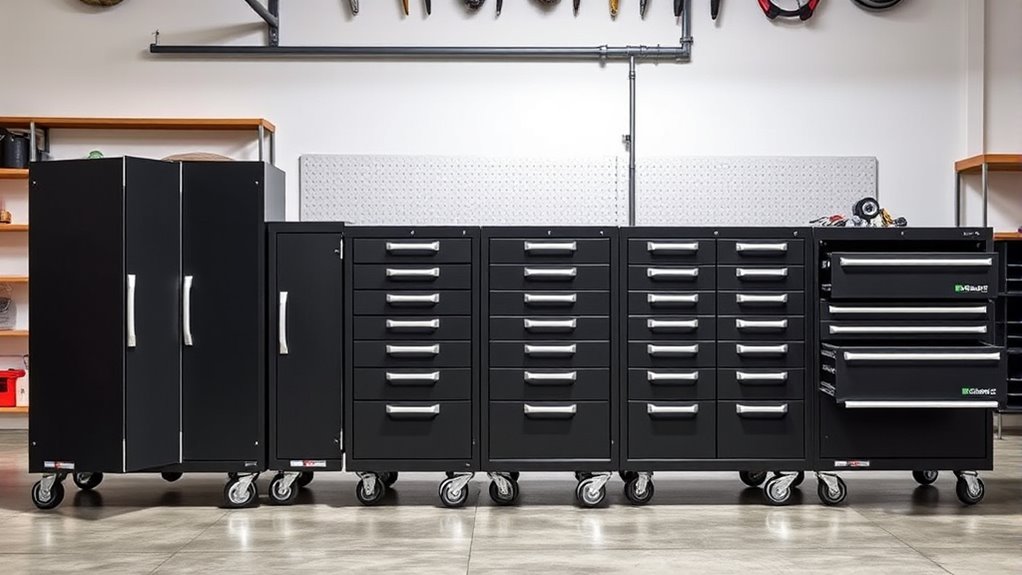 Looking to organize your garage effortlessly? I recommend checking out the 15 best rolling tool cabinets, like TUFFIOM’s 5-drawer chest, metal storage units with wheels, or models with lockable drawers and stainless tops. These cabinets combine durability, security, and mobility, making every task easier. They feature adjustable shelves, anti-slip liners, and lock-in wheels to keep everything stable and secure. Keep going, and you’ll discover detailed options to suit your space and needs.