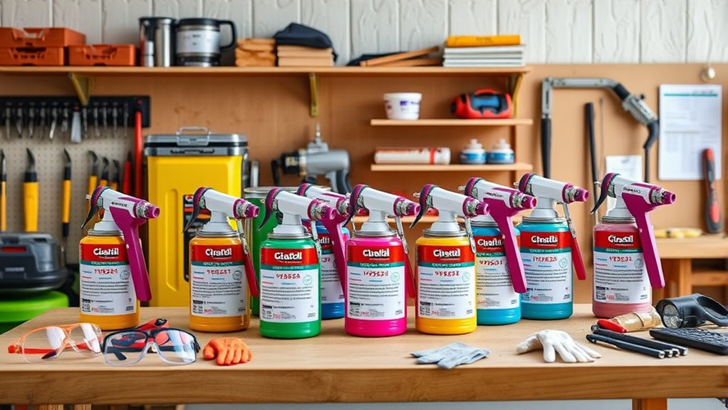 Proper storage and temperature management are essential for guaranteeing spray foam insulation kits perform as intended. Keep cans between 68°F and 86°F to maintain ideal expansion and curing. Temperatures below 41°F can cause foam to underperform or clog the spray nozzle, resulting in uneven insulation. Conversely, high temperatures above 86°F accelerate curing, reduce shelf life, and increase the risk of leaks or can rupture. Store cans in a cool, dry place away from direct sunlight to prevent chemical degradation. Before application, let the cans warm to room temperature to promote even expansion and proper adhesion. Proper handling and storage ensure consistent results, longer shelf life, and reliable performance during your home improvement projects.