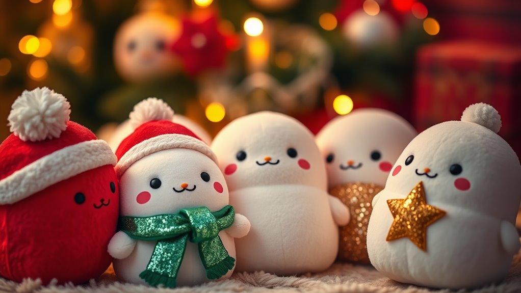 Seasonal themes and designs play a crucial role in selecting the perfect holiday Squishmallows, as they help capture the festive spirit and make your collection more appealing. Limited edition holiday designs often feature iconic symbols like Christmas trees, gingerbread cookies, or peppermint motifs, enhancing their seasonal charm. Choosing designs that reflect specific holiday aesthetics can make your collection more cohesive and visually striking. These themed designs also add a special touch to gift-giving, aligning with seasonal traditions and celebrations. Plus, unique motifs not only boost the visual appeal but can increase the collectible value of your Squishmallows, making them more desirable for holiday enthusiasts and collectors alike. Focusing on festive themes ensures your collection radiates holiday cheer all season long.
