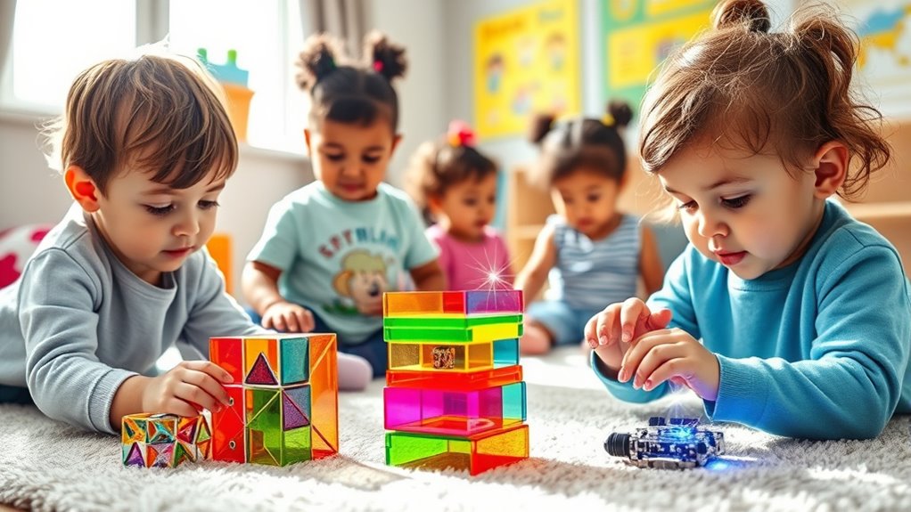 If you’re looking for the 10 best STEM toys to ignite your toddler’s curiosity and learning, I recommend exploring options like engaging building sets, magnetic tiles, dinosaur take-apart kits, and age-appropriate microscopes. These toys foster problem-solving, creativity, and motor skills while being safe and durable. Choosing the right toys depends on your child’s age and developmental stage. Keep reading, and you’ll find detailed insights on selecting the perfect STEM toys to support your child’s growth.