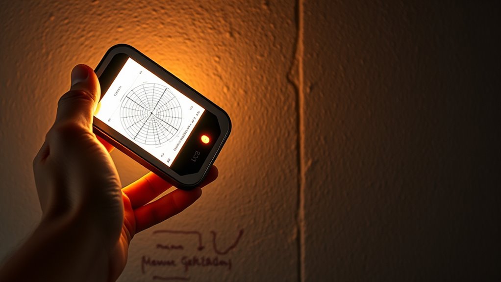 When choosing a stud finder, display clarity and alert systems play a vital role in guaranteeing accurate wall mapping. A clear, high-contrast LCD or LED screen helps me easily identify stud edges, centers, and hidden objects behind walls. Bright backlit displays are especially useful in dimly lit spaces, reducing mistakes. Visual alerts like pecking shapes or highlighted areas give intuitive guidance on object locations, making it simpler to interpret results without guesswork. Audio signals, such as beeps, complement visual cues, providing reliable feedback in noisy environments. Consistent, responsive alert systems ensure I receive timely notifications for detected objects or low battery warnings. Overall, a user-friendly display combined with effective alerts boosts confidence and accuracy during wall scanning.