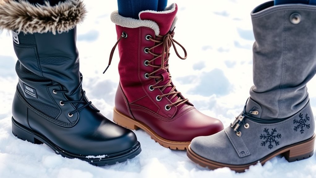 Insulation effectiveness is a critical factor in selecting waterproof snow boots for women because it directly impacts how warm and comfortable your feet stay in cold conditions. The insulation material, like 3M Thinsulate or Thermolite, plays a key role in retaining heat, with thicker insulation—measured in grams—offering better warmth. For example, 200g insulation provides more warmth than lighter options. Faux fur linings also boost comfort and add thermal insulation, especially around the cuffs. Proper insulation prevents heat loss through the sole and upper parts, keeping your feet cozy during outdoor winter activities. However, insulation can be compromised if boots aren’t waterproof, as moisture reduces heat retention. So, choosing boots with high-quality insulation and waterproof features is essential for staying warm and dry.