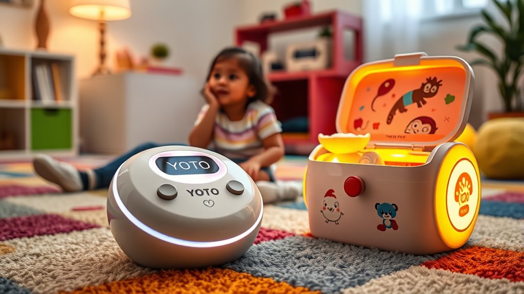 I believe both Yoto players and Toniebox offer great features, but they suit different needs. Yoto Mini excels with a wide library, customizable content, and high-quality sound, perfect for curious children. Toniebox is incredibly durable and simple to use, ideal for younger kids and active families. Depending on what matters most—flexibility or durability—you might prefer one over the other. Keep going to discover which really takes the lead in 2025 and what makes each stand out.